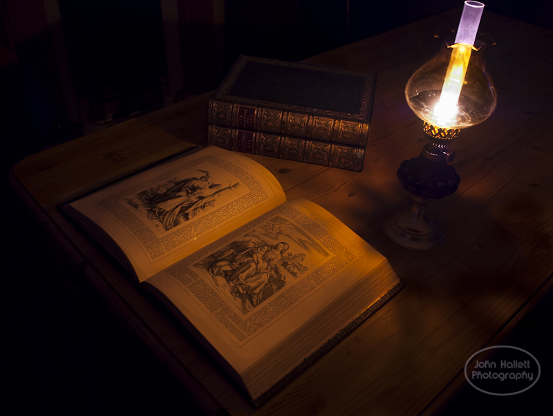 It was now time to shut the blackout blinds, light the oil lamp and turn off the lights. With the camera tethered to the laptop (see Tethered shooting) I could operate the shutter remotely rather than fumbling around with the camera in the dark and, after some trial-and-error, I eventually settled on a 15 second exposure using a chosen aperture of f/9.0 (to get the desired depth of field) and a sensitivity of ISO100 (to minimise noise in the shadows).