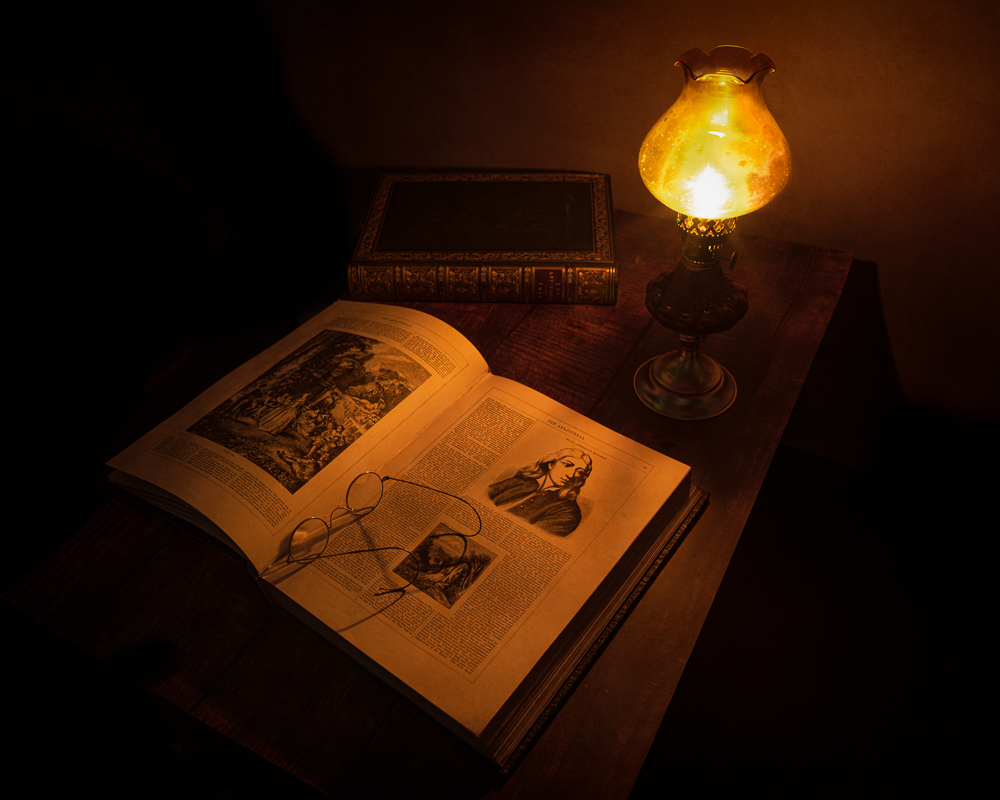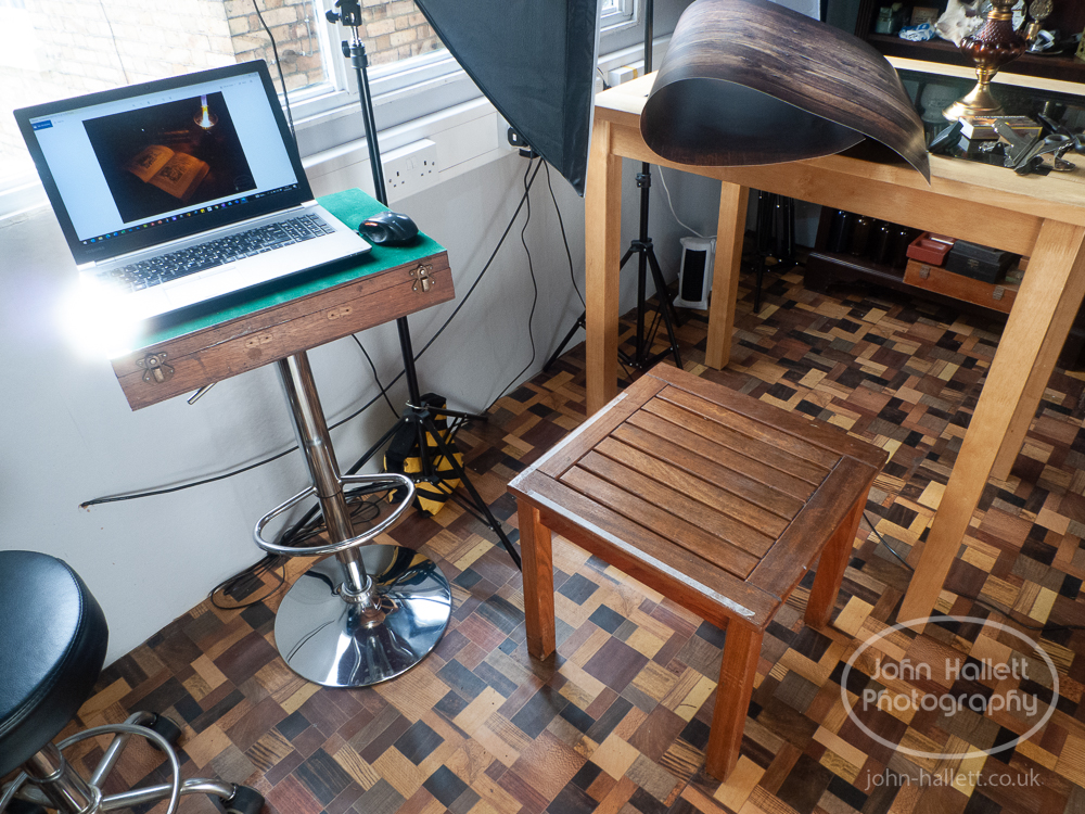 So, my plan was to recreate the shot as a high-resolution RAW file in my studio. The first hurdle to overcome was that we no longer have the farmhouse table (and it wouldn’t have fitted into the studio anyway) and so I needed to create an illusion of a similar table. Also, because this shot was taken from a height looking down, I would have to use a lower platform than my usual product-shot table in the studio. Other than that I still have the books and also the oil lamp (it was the one I used in my blog post ‘Royal Daylight‘), although I thought that I might also incorporate an old pair of spectacles into the shot to give the impression of a disturbed reading session.