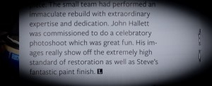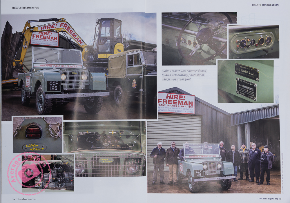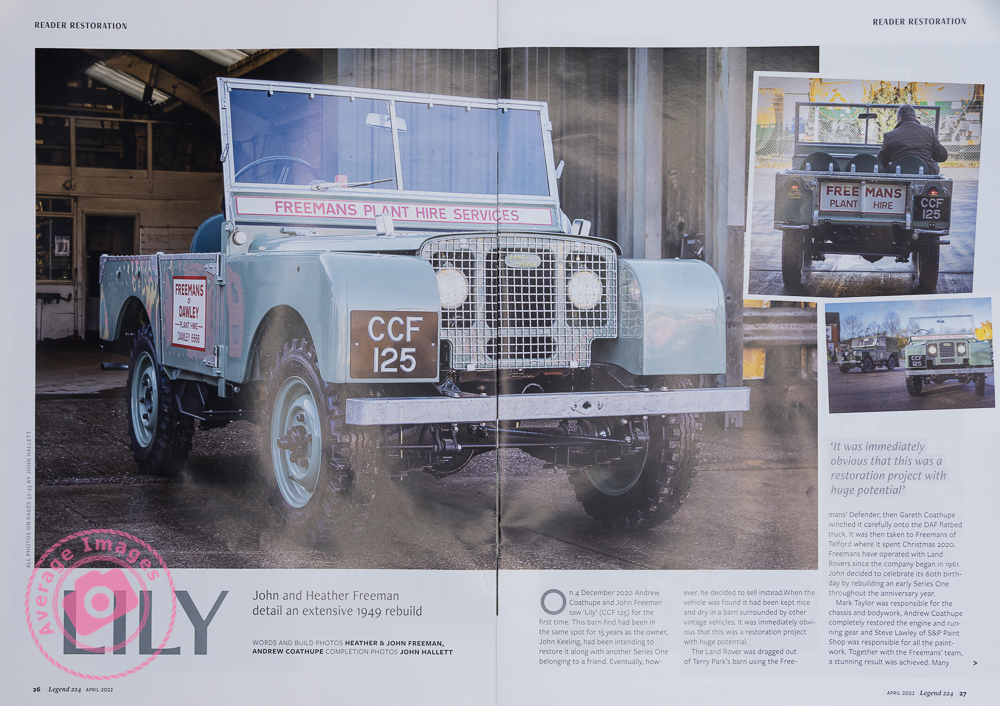 Some time ago, I was contacted by John, the owner of Freemans Plant Hire, to carry out a photoshoot to commemorate the company’s 60th birthday. I met, with the Freemans team, at their site one Saturday morning with a series one Landrover called Lily, which the team had painstakingly renovated as part of the celebrations. Over a few hours I took photographs of the vehicle detailing and various group shots. The images were used in a magazine dedicated to the series one Landrover called ‘Legend’ and I was pleased to see that they had used 11 shots including a centre spread and the all-important cover shot.