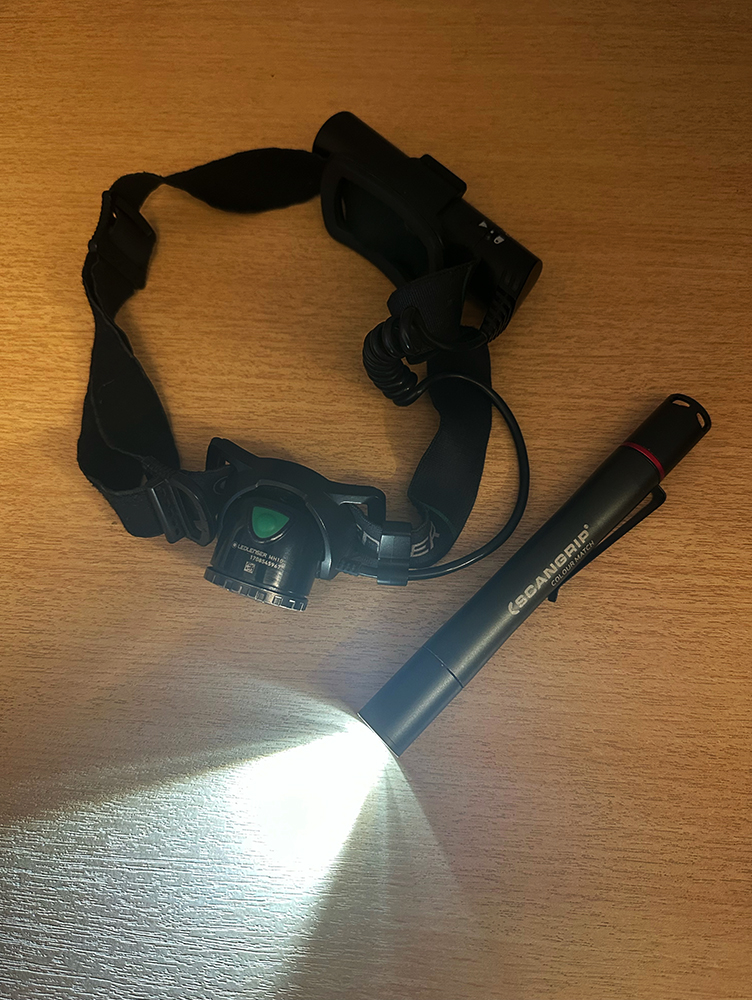 Fourthly, and perhaps obviously, some lights. Torches are more than adequate, and I use a powerful Ledlenser MH10 head torch for the larger areas (and to see when moving about), together with a smaller Scangrip Matchpen pen torch for detailed lighting. The head torch has a zoom function, which is handy for lighting the tops of trees, and the pen torch (which is actually designed for inspecting the paintwork of cars) has two different light temperature settings, which is something I will try out in a later blog post.