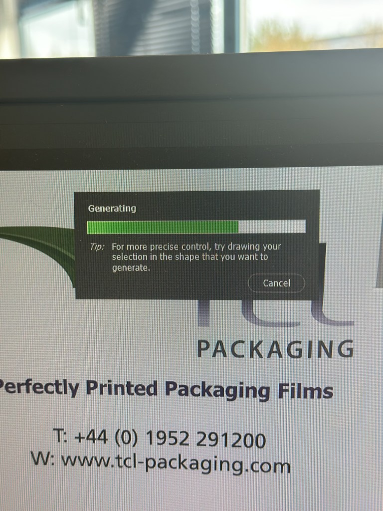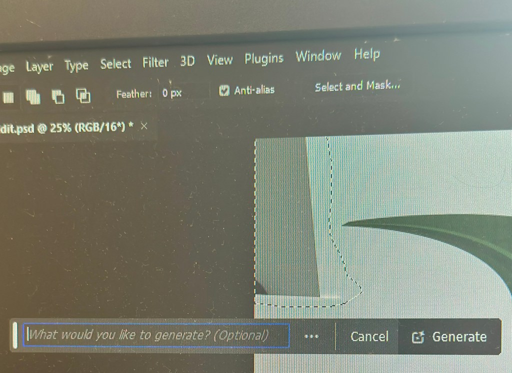 With the image open in Photoshop, I needed to select the area with the missing background, so I chose the lasso tool and traced around as close as possible. As I completed the selection, the floating Contextual taskbar automatically changed to the Generative Fill taskbar.