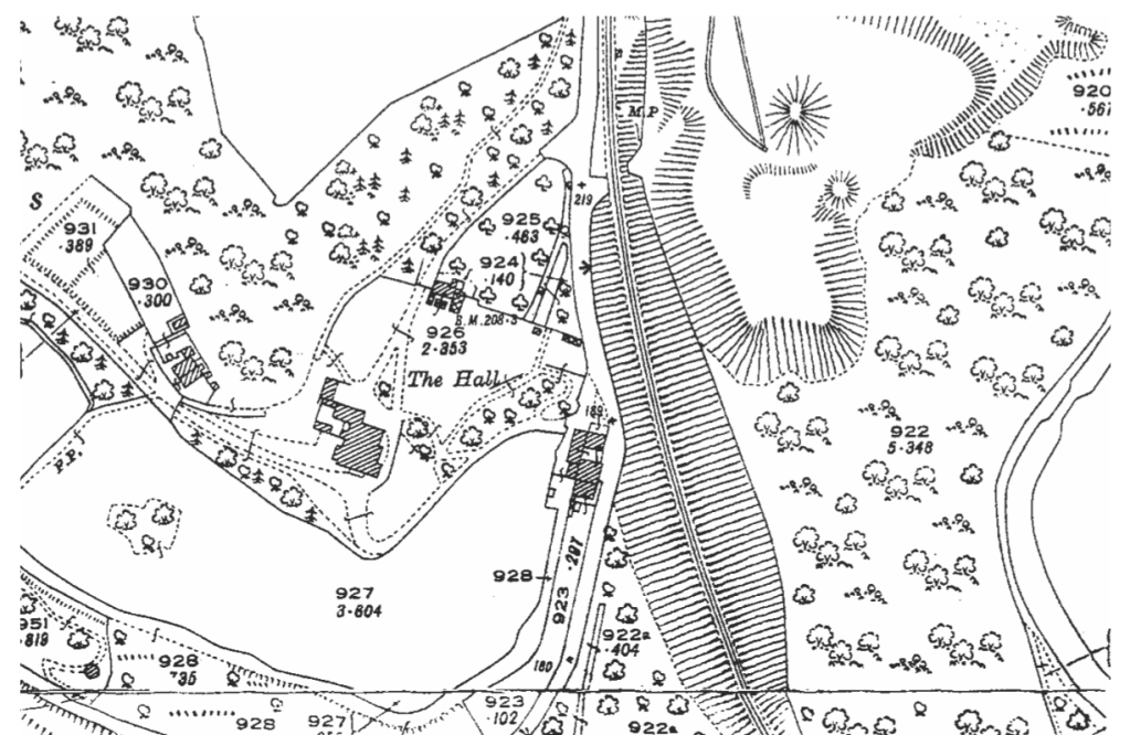 Here is a section of an old map from 1927 showing that the hall was quite substantial in size. The ice house is the upper-most outbuilding and was detached from the main hall (sensible, I guess, if it was full of ice). You can also see the semi-detached houses to the left and the landscaped area that used to be the tennis court.