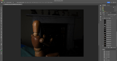 Because I will be using multiple images and blending them into one composite, I need to work with layers – and since Lightroom cannot do that (yet), I transfer the chosen images into Adobe Photoshop for the actual creation of the composite. To do this, I select them all, right-click and choose ‘Edit in Photoshop as individual layers’. This will open Photoshop with all the shots as one file in a series of layers created from each torch-lit shot.