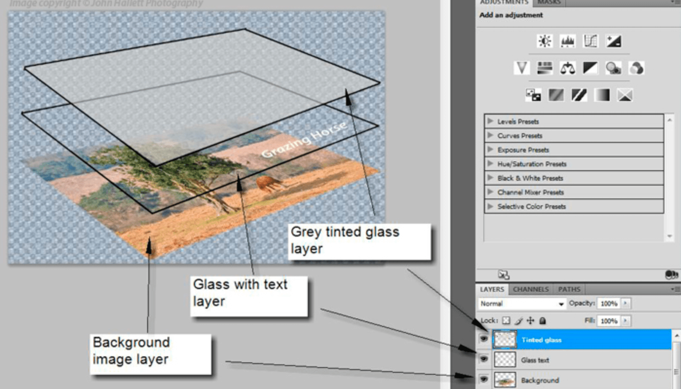 This analogy describes how layers work. They can be altered individually to change the overall appearance of the image, but it is non-destructive, and so the original image remains untouched at all times.