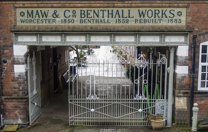 The company was founded in Worcester in 1850 by John Hornby Maw and his two sons, George and Arthur, but the shortage of good quality clay in that area meant that they shifted the entire operation (including the employees) to Benthall, near Broseley, in 1852. To take advantage of the transportation opportunities of the new Great Western Railway line, the site relocated again in 1883 to the site of an existing brickworks at Jackfield (this explains the somewhat confusing name “Benthall Works” above the entrance).