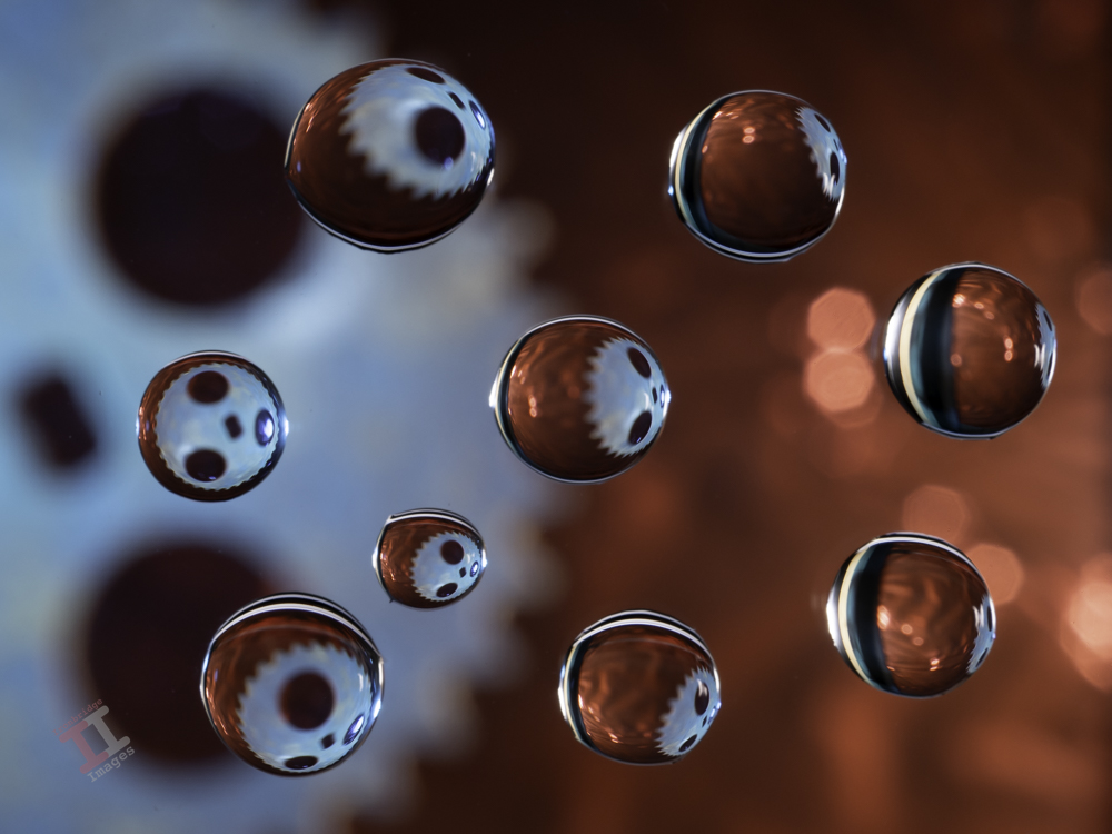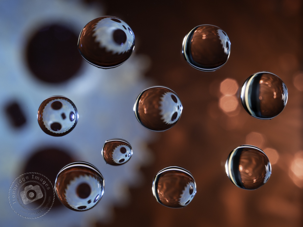 The basic premise of Hydro Droplets photography is that a droplet (or sphere) of water will refract an extremely wide-angle view of its surroundings (similar to a fisheye lens). By controlling the position of multiple droplets, fascinating patterns can be created, both by the droplets themselves and by the view that they refract.