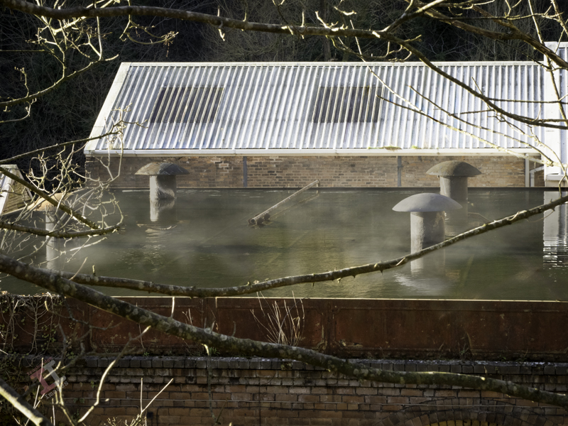 This building was the compressor house for the Coalbrookdale Works. The compressors were water-cooled (compressing air generates a huge amount of heat) and the heated water was pumped through the mushroom domes onto the flat roof to allow it to naturally cool, before draining back down to the compressors below to repeat the cycle. I can vividly remember as a child, when visiting my Aunty who lived nearby, passing by this building and seeing the hot water gushing from the domes, with plumes of steam rising from the rooftop as it cooled.